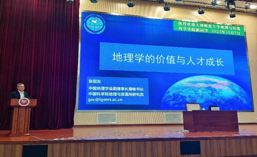 张国友研究员为同学们讲授了《地理学的价值与人才成长》的开学第一课,他从地理学的学科属性、地理学的价值与成就、如何成为地理学家、关于中国地理学会四个方面展开。张国友研究员提到,地理学具有综合性、交叉性、区域性和复杂性,是横跨自然科学与人文社会科学的综合性交叉学科。他希望同学们学好地理,形成可持续发展的思想和观念,掌握地理学的理论和方法,解决人类可持续发展中面临的问题。弘扬科学精神,传播地理文化,运用地理综合思维,为实现中华民族伟大复兴的中国梦作出贡献。