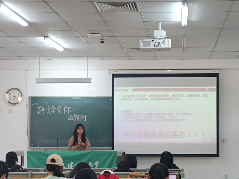 人文地理与城乡规划专业2005班张娅同学以专业课、思想政治理论、外国语和复试四个模块进行经验分享,提示大家在查找资料时要注意辨别信息真伪,重视反复做题,巩固复习内容,强化复习成果,并鼓励低年级同学多去图书馆学习,感受浓厚的学习氛围,同时,在备战期间也要注重自身心理建设,调节好自身心态,避免焦虑,在充实和快乐学习之间找到平衡点。