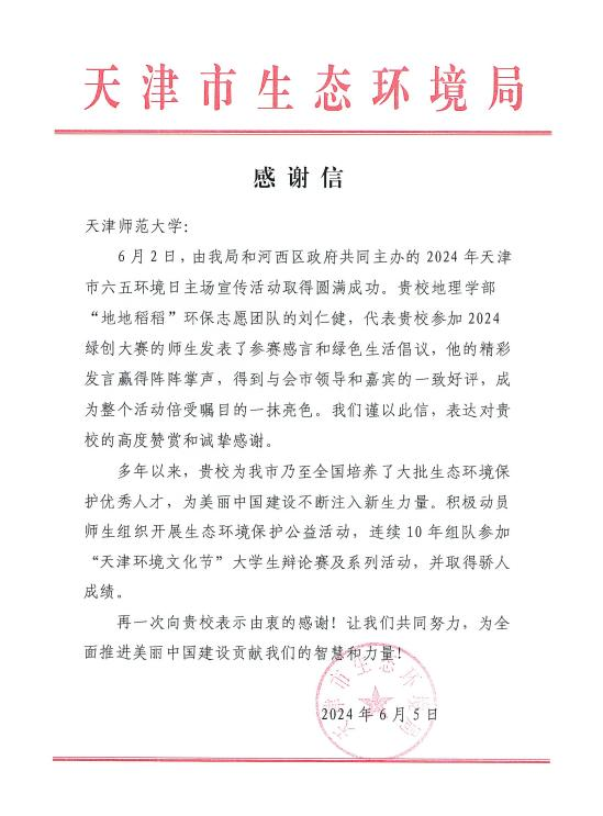 信中提到,在2024年天津市六五环境日主场宣传活动中,地理学部“地地稻稻”环保志愿团队的刘仁健,代表我校参加2024绿创大赛的师生发表了参赛感言和绿色生活倡议,得到与会市领导和嘉宾的一致好评。多年来,天津师范大学为我市乃至全国培养了大批生态环境保护优秀人才,积极动员师生组织开展生态环境保护公益活动,连续10年组队参加“天津环境文化节”大学生辩论赛及系列活动,并取得骄人成绩。特此对刘仁健同学提出表扬,并向天津师范大学表示由衷的感谢。