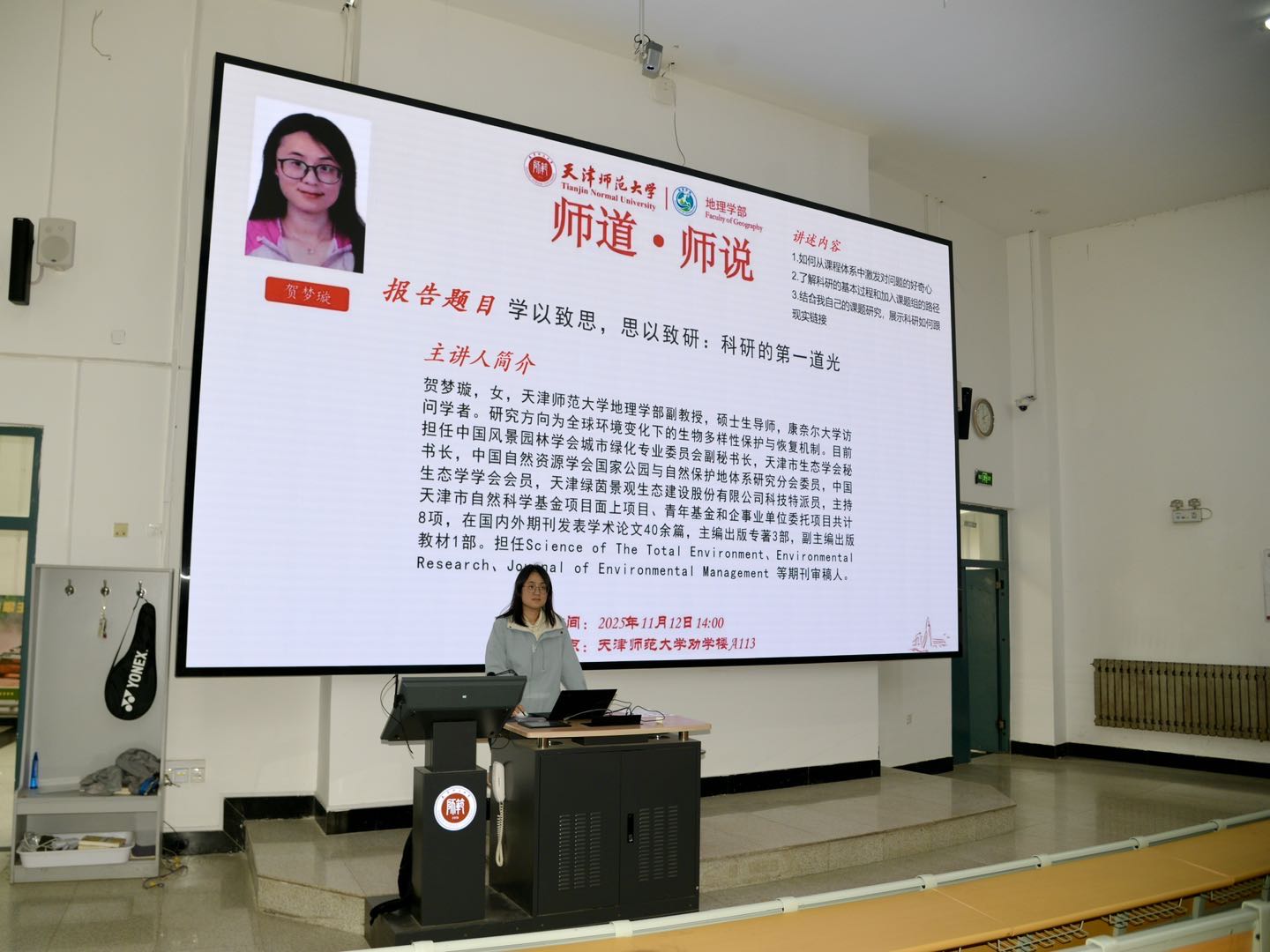 为进一步助力本科生合理规划学业发展道路、萌发科研参与意识,发挥青年教师的引领带动作用,地理学部“师道·师说”系列讲座第二讲于11月12日在劝学楼A113举办。本场讲座邀请地理学部青年教师贺梦璇主讲,由地理学部党委副书记刘亮主持,学部2025级本科新生参加。